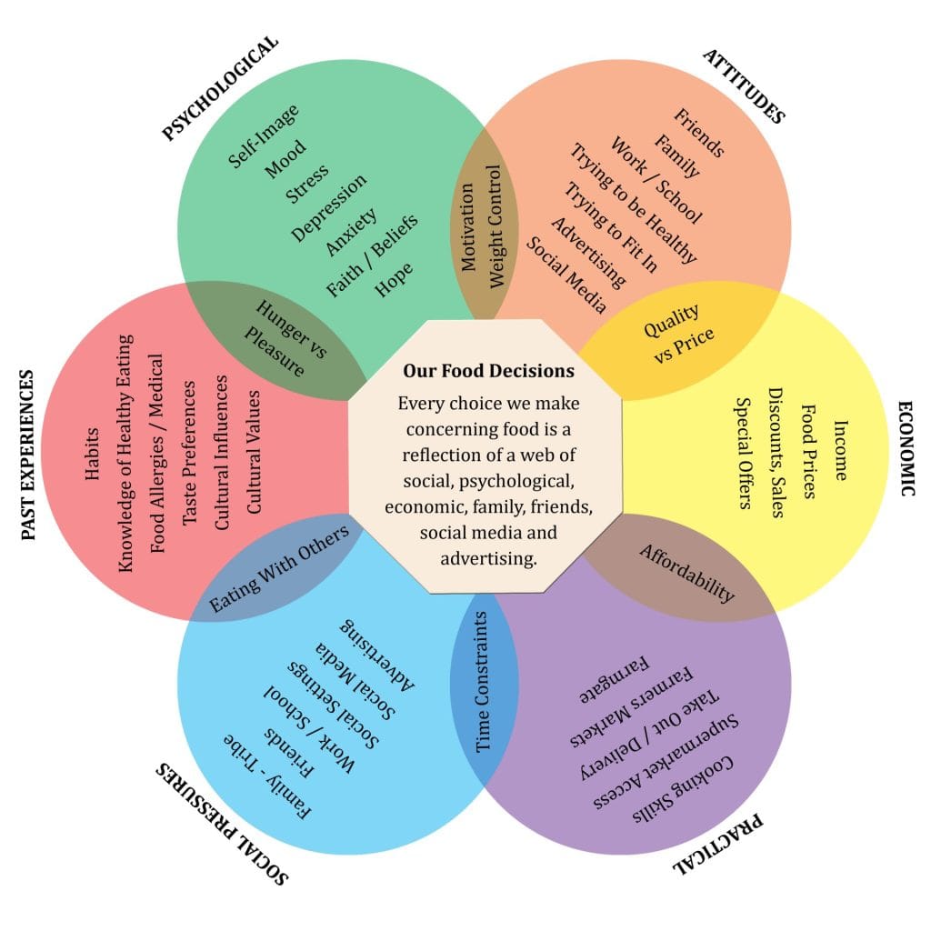 People develop poor eating habits over time based on a number of factors that assist in making food choices. Many social and economic factors interact in a complex manner to shape individual dietary patterns, such as food preferences, income, food prices, beliefs, cultural traditions, geographical and environmental aspects. The psychology behind how, why and what we eat is very complex and involves many, many factors. The following chart breaks down just how we make those decisions.